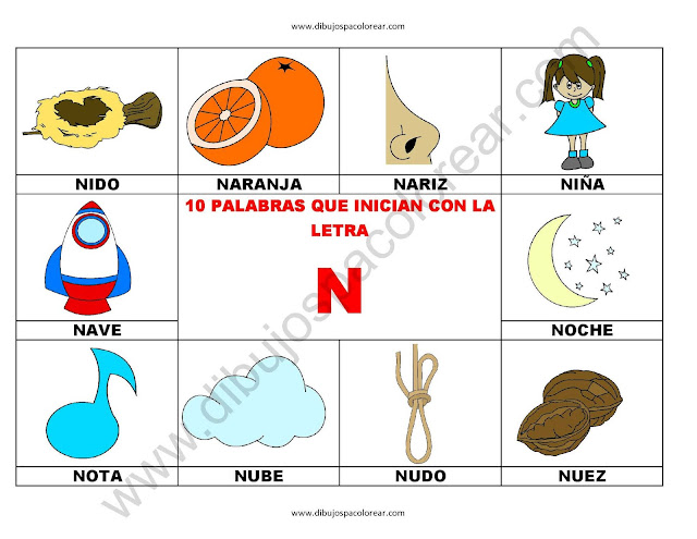 Hola, ya llevamos más de la mitad de las letras del abecedario y le toca el turno a la letra n, claro, con su lista con dibujos: