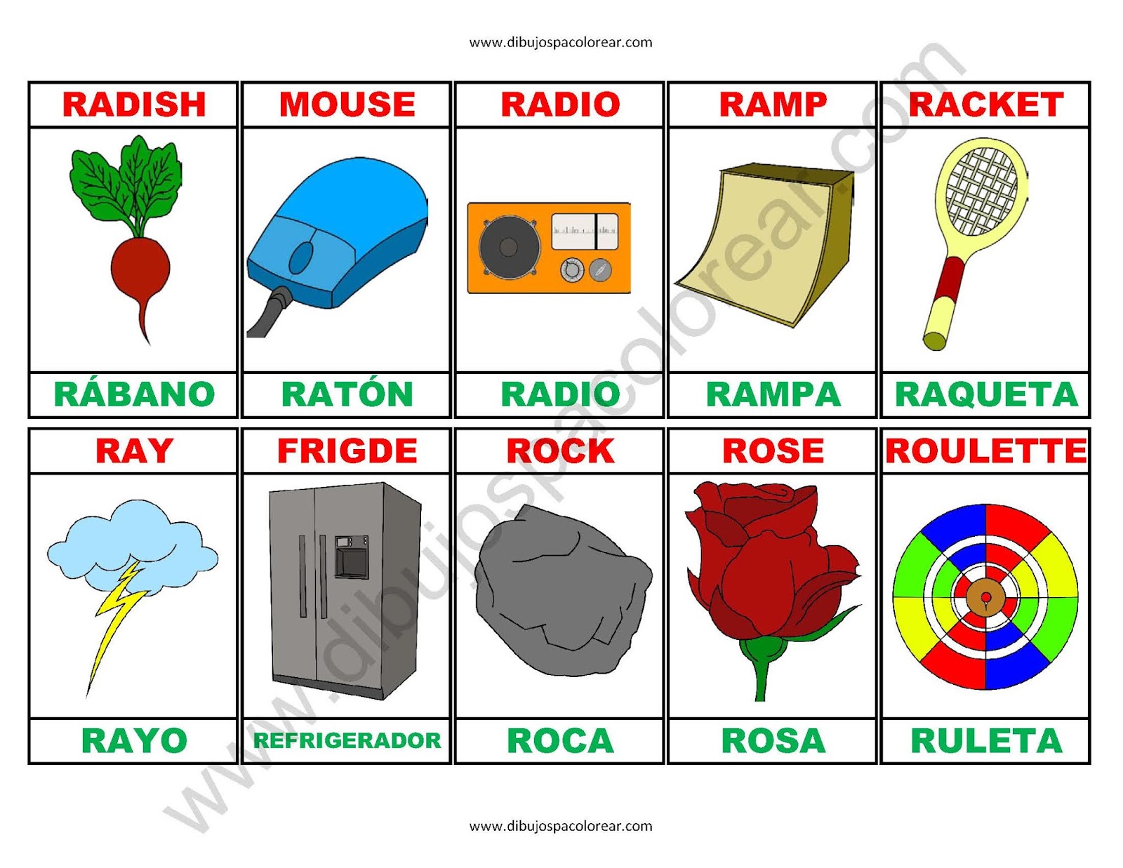 Esperamos que disfrutes de este memorama de la letra R en español - ingles, El memorama esta listo para que lo imprimas en tamaño carta, recórtalo y juega.