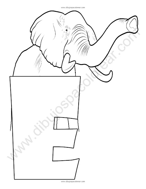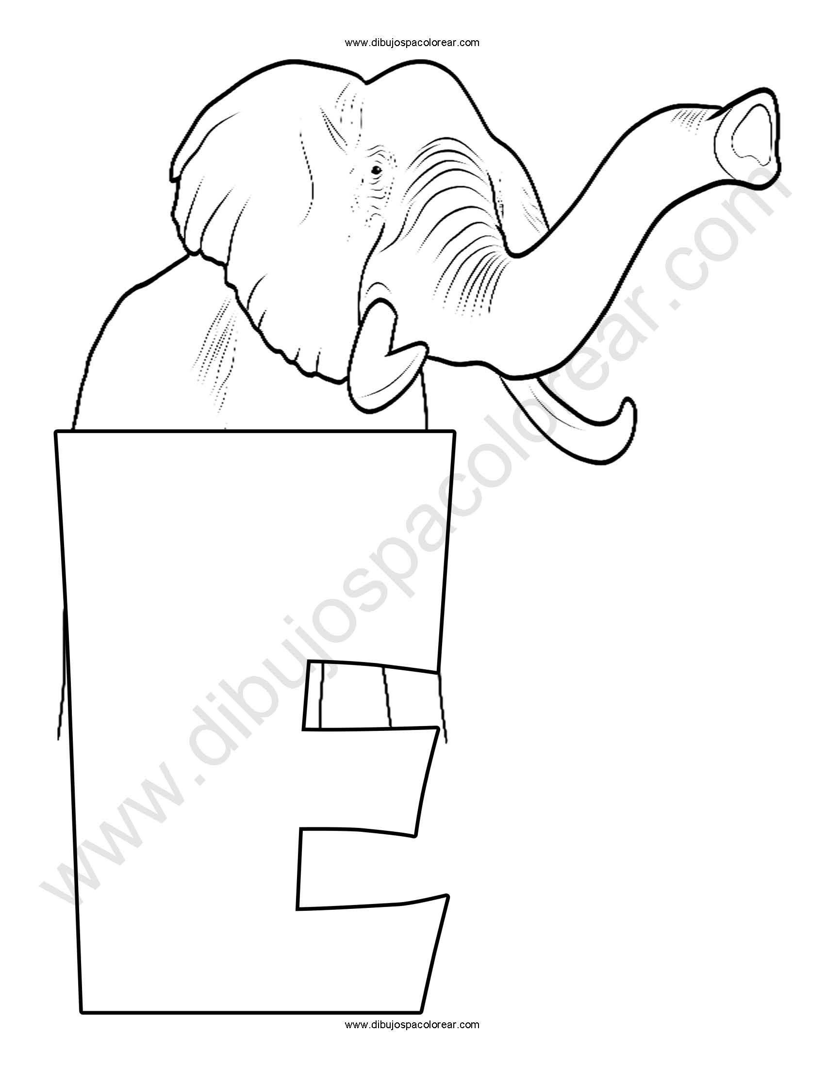 Letra E Elefante abecedario dibujo a color y para colorear.