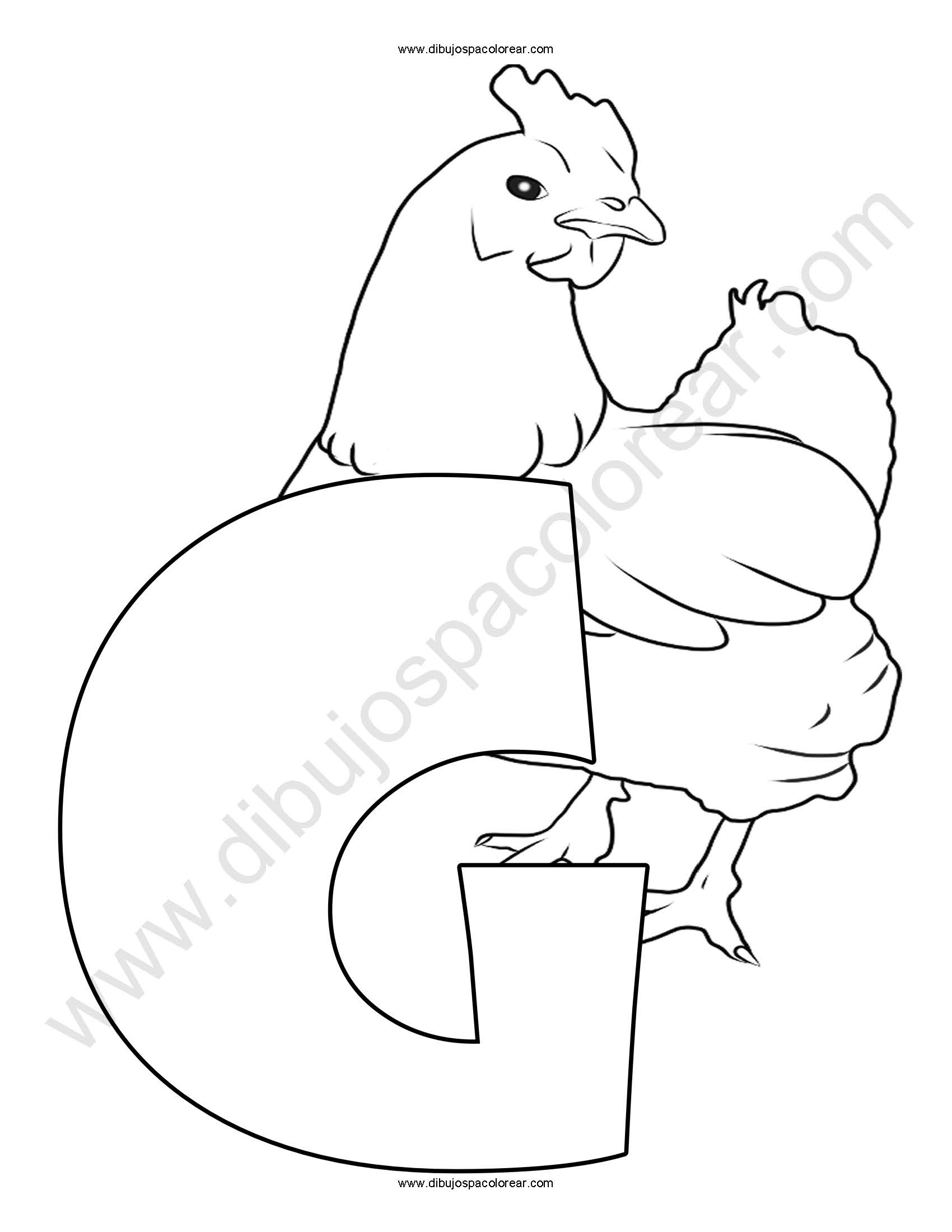 Letra G Gallina abecedario dibujo a color y para colorear.