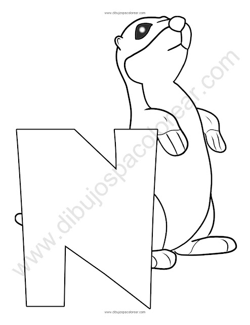 Letra N Nutria abecedario dibujo a color y para colorear.