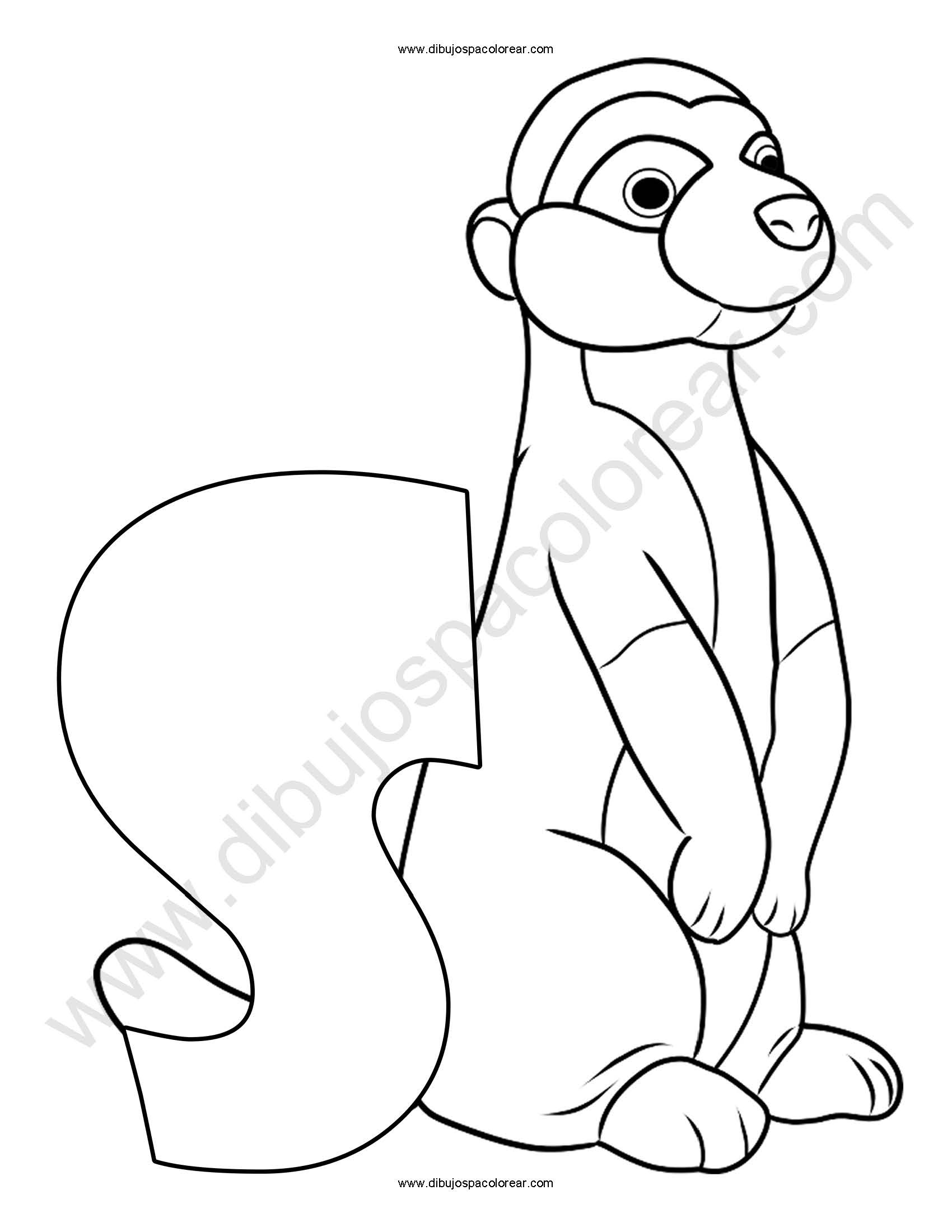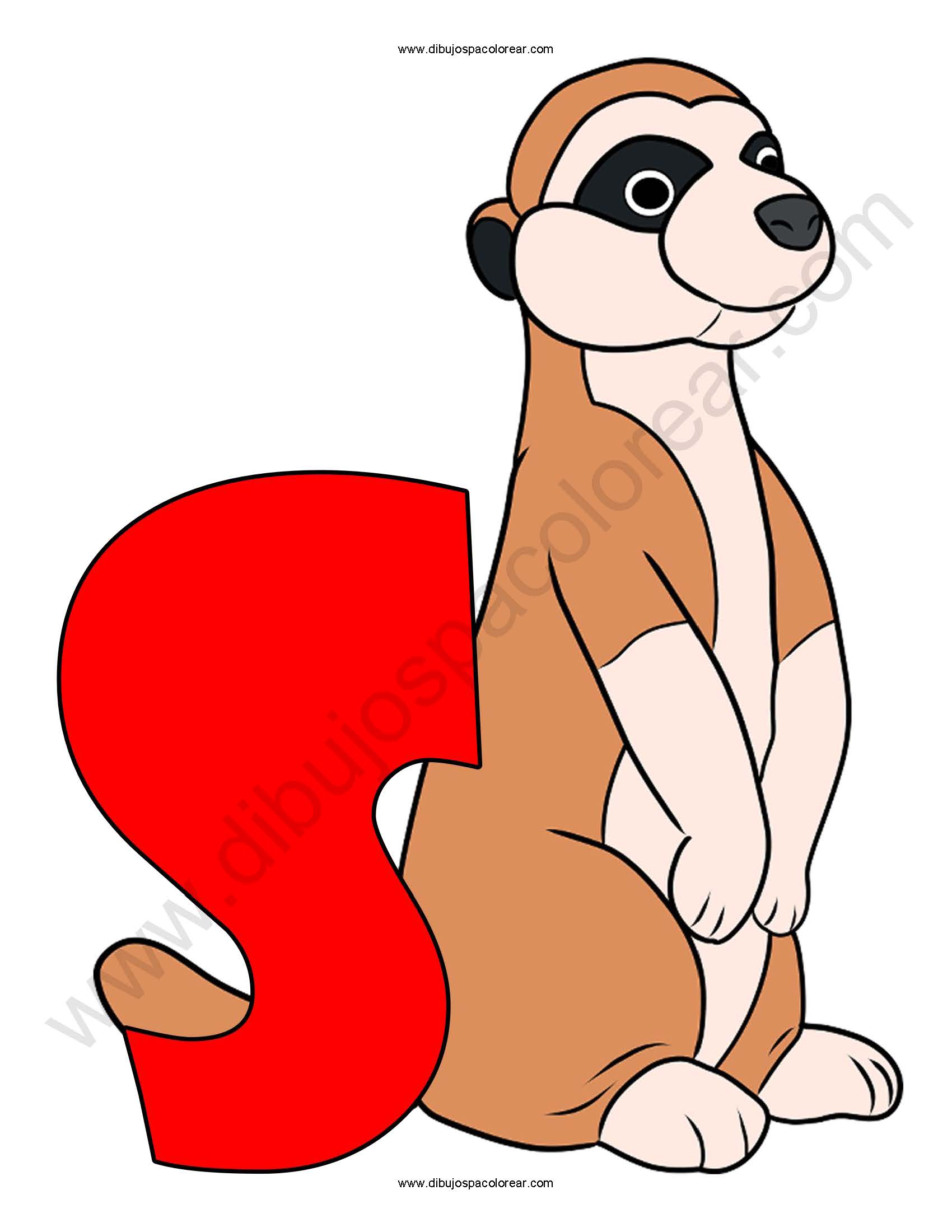 Letra S Suricata abecedario dibujo a color y para colorear.