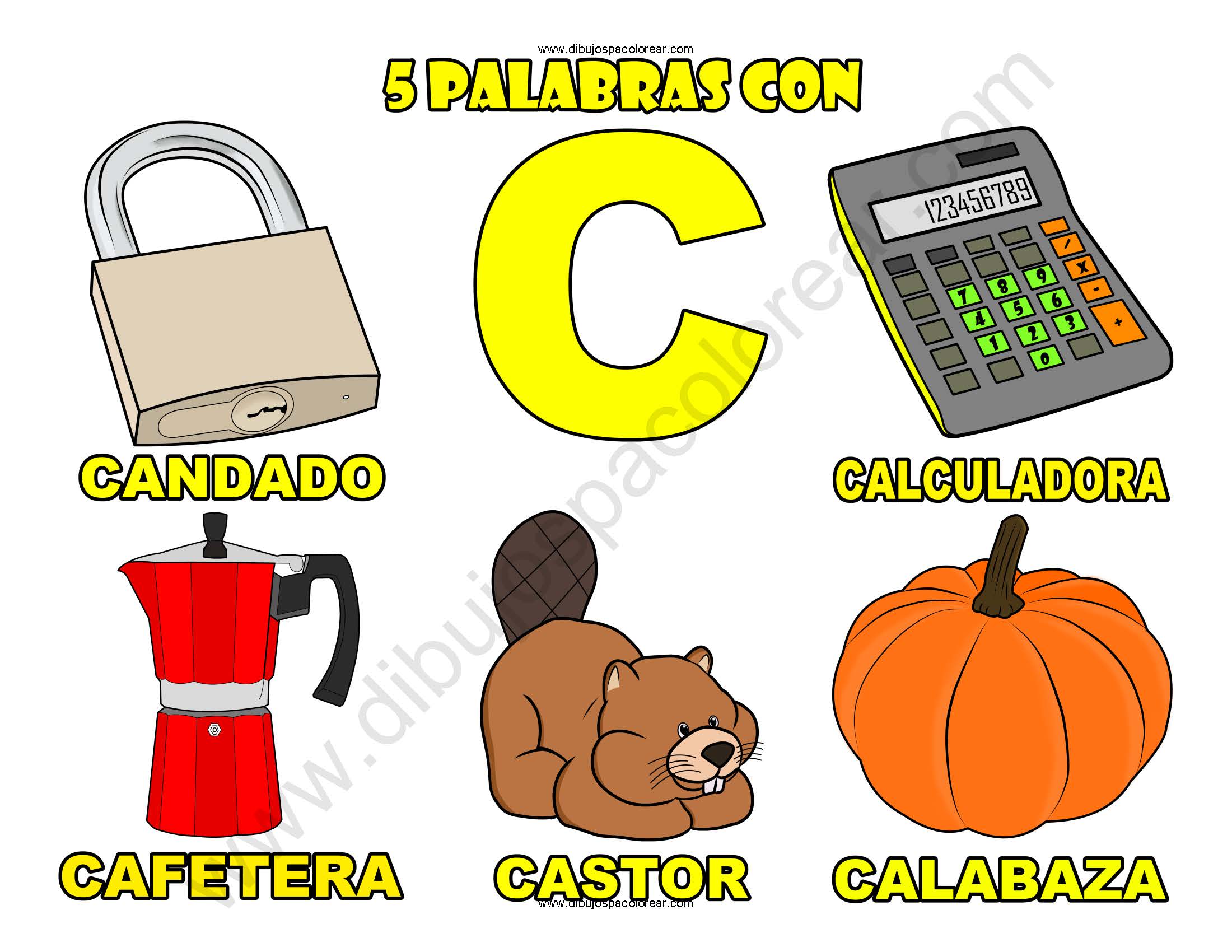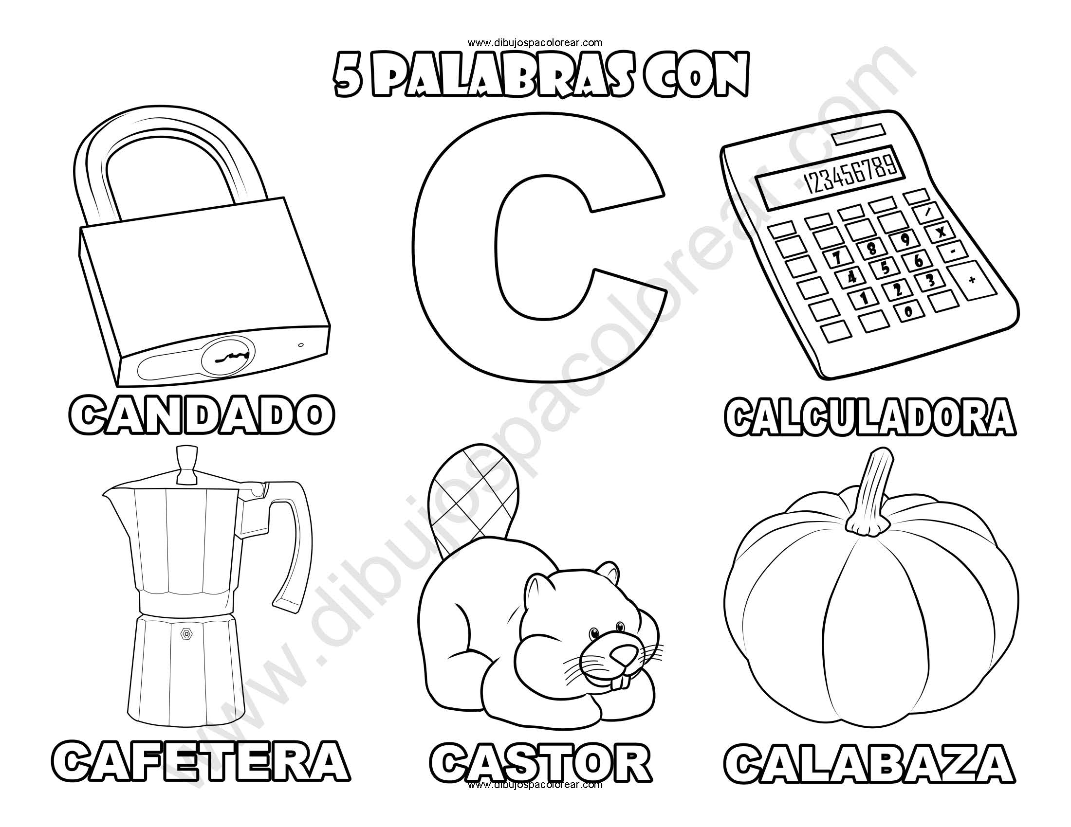 Cinco Palabras con la letra C dibujo a color y para colorear.