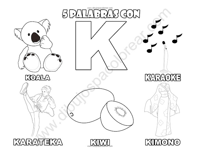 Cinco Palabras con la letra K dibujo a color y para colorear.