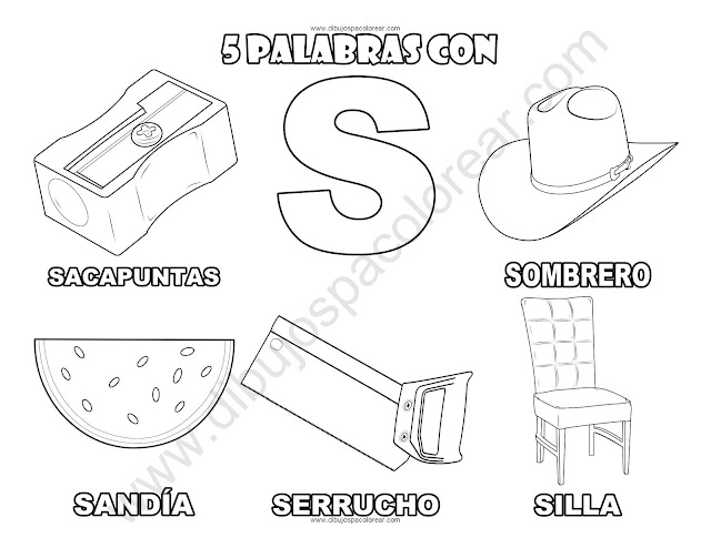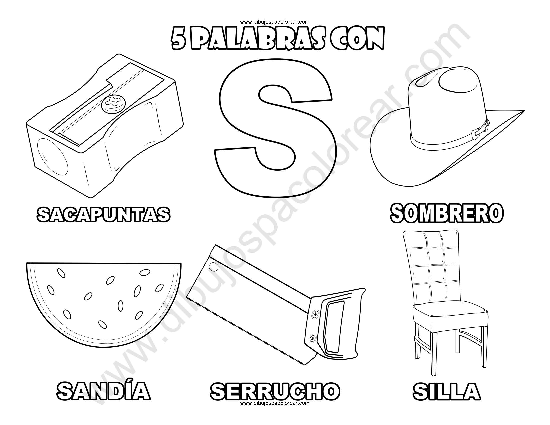Cinco Palabras con la letra S dibujo a color y para colorear.