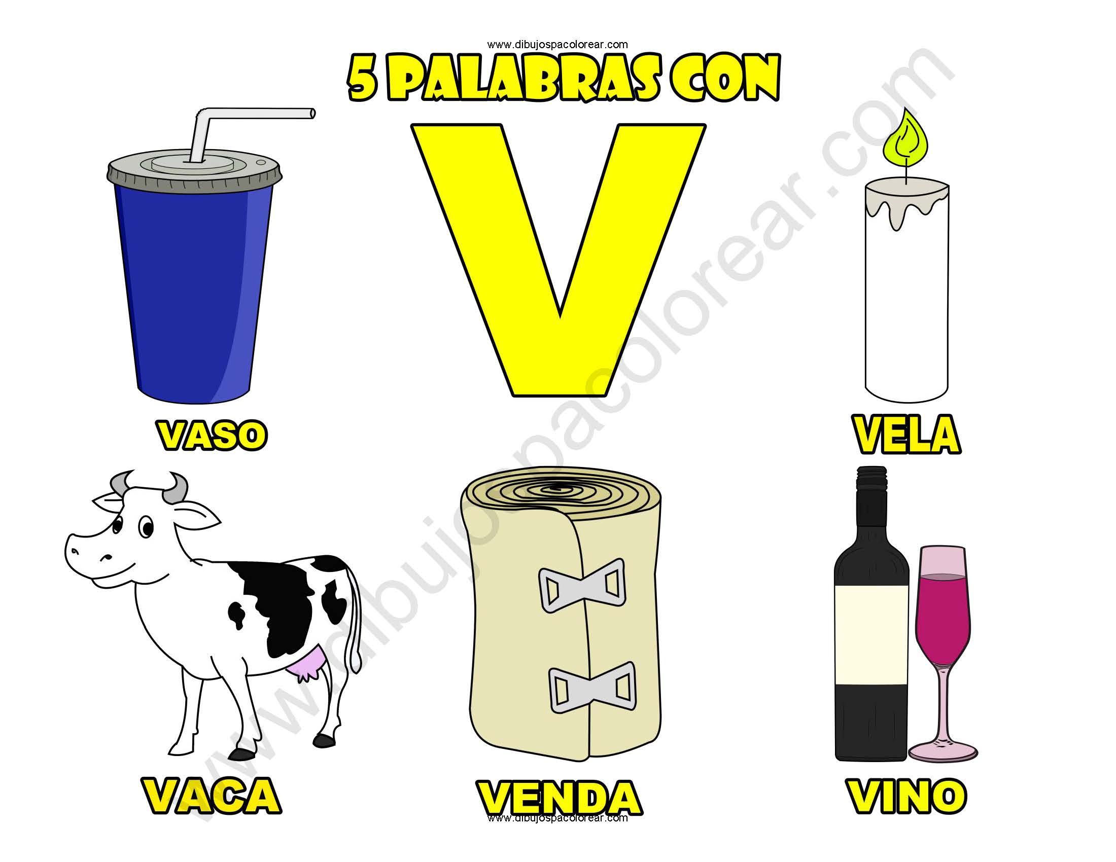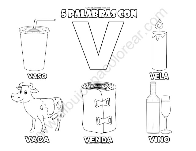 Cinco Palabras con la letra V dibujo a color y para colorear.