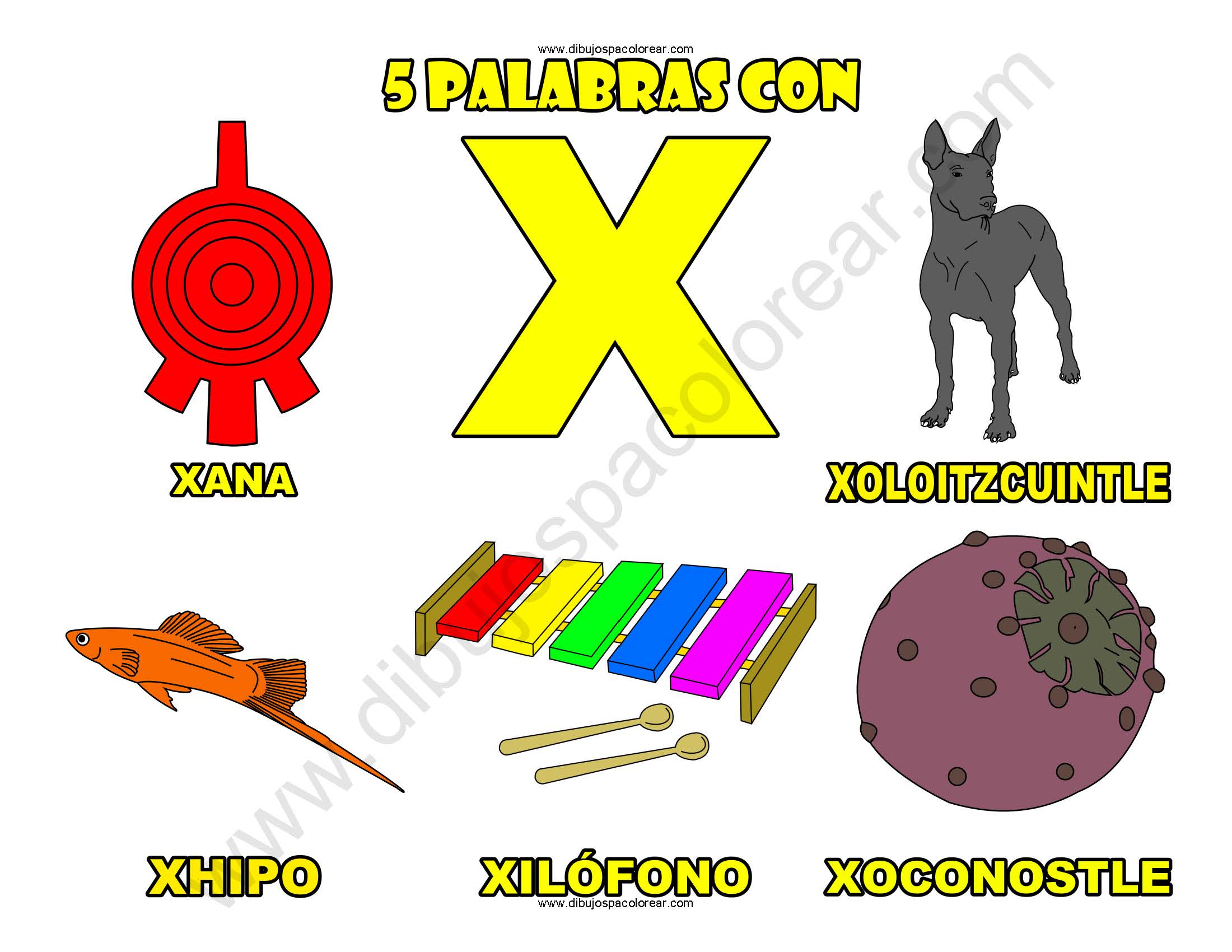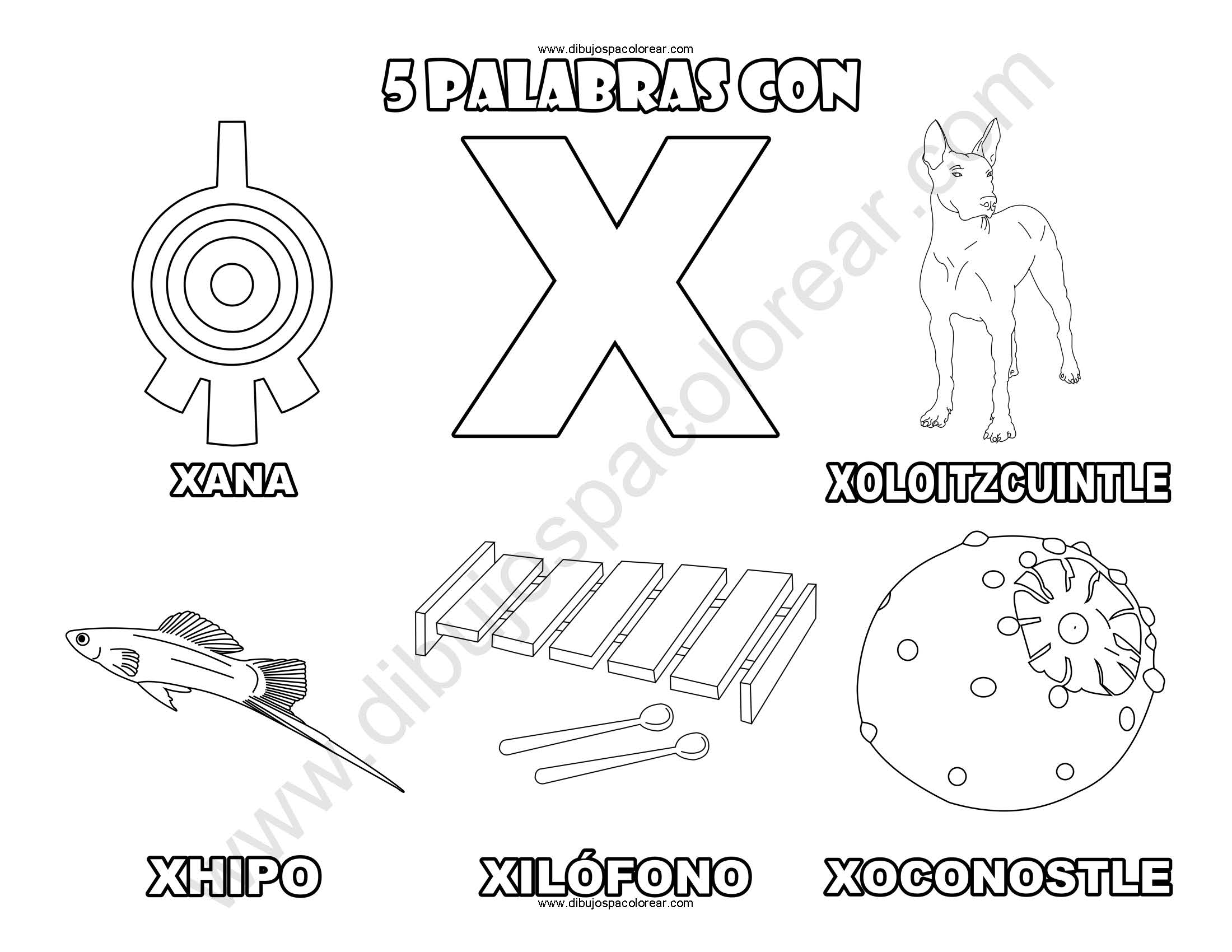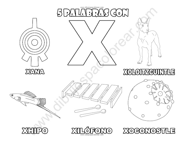 Cinco Palabras con la letra X dibujo a color y para colorear.
