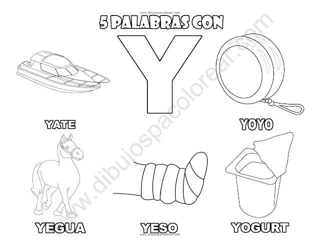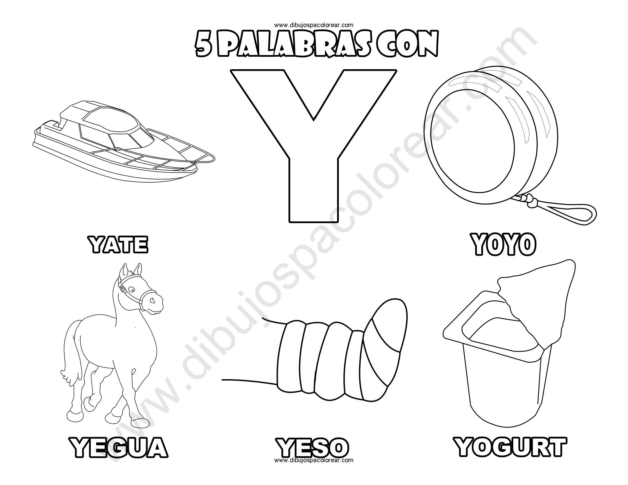 Cinco Palabras con la letra Y dibujo a color y para colorear.