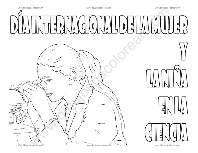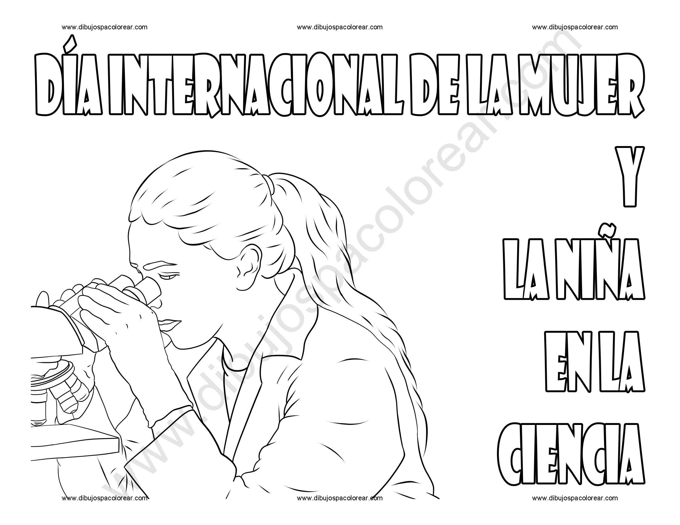 Día Internacional de la Mujer y la Niña en la ciencia dibujo a color y para colorear.