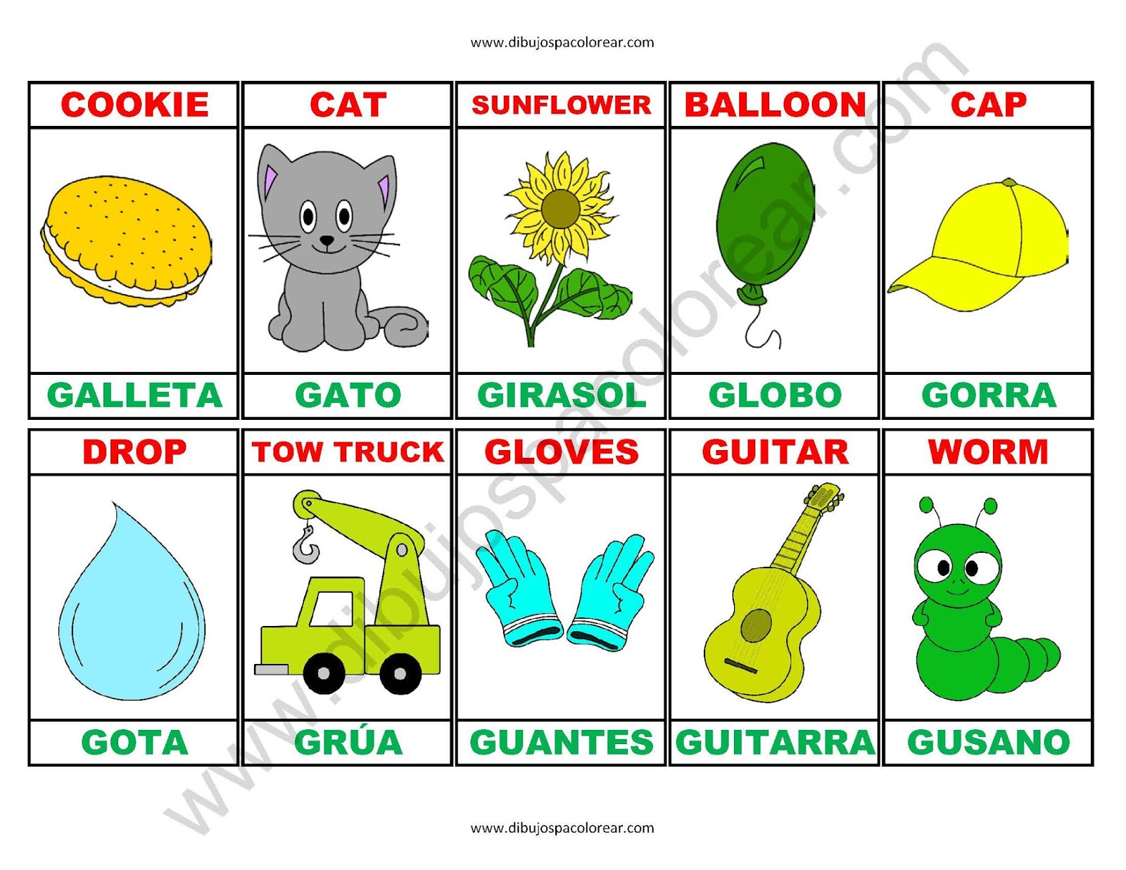 Esperamos que disfrutes de este memorama de la letra G en español - ingles, El memorama esta listo para que lo imprimas en tamaño carta, recórtalo y juega.