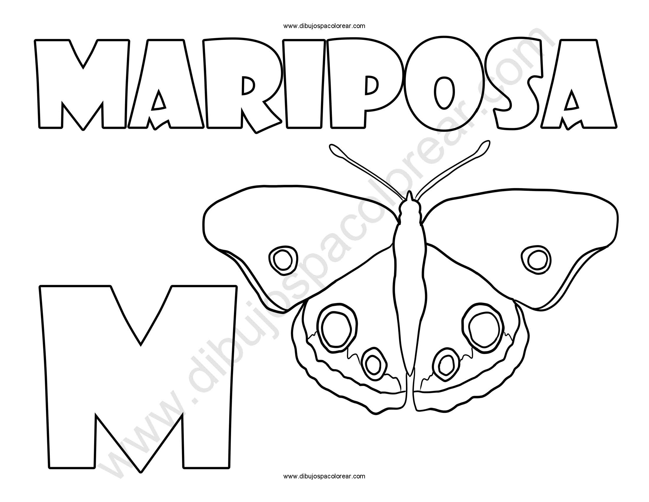 Mariposa letra M abecedario dibujo a color y para colorear.