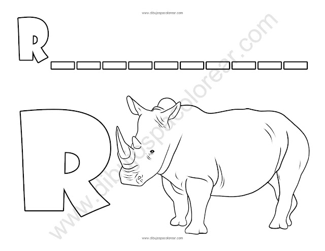 Rinoceronte letra R abecedario dibujo a color y para colorear.