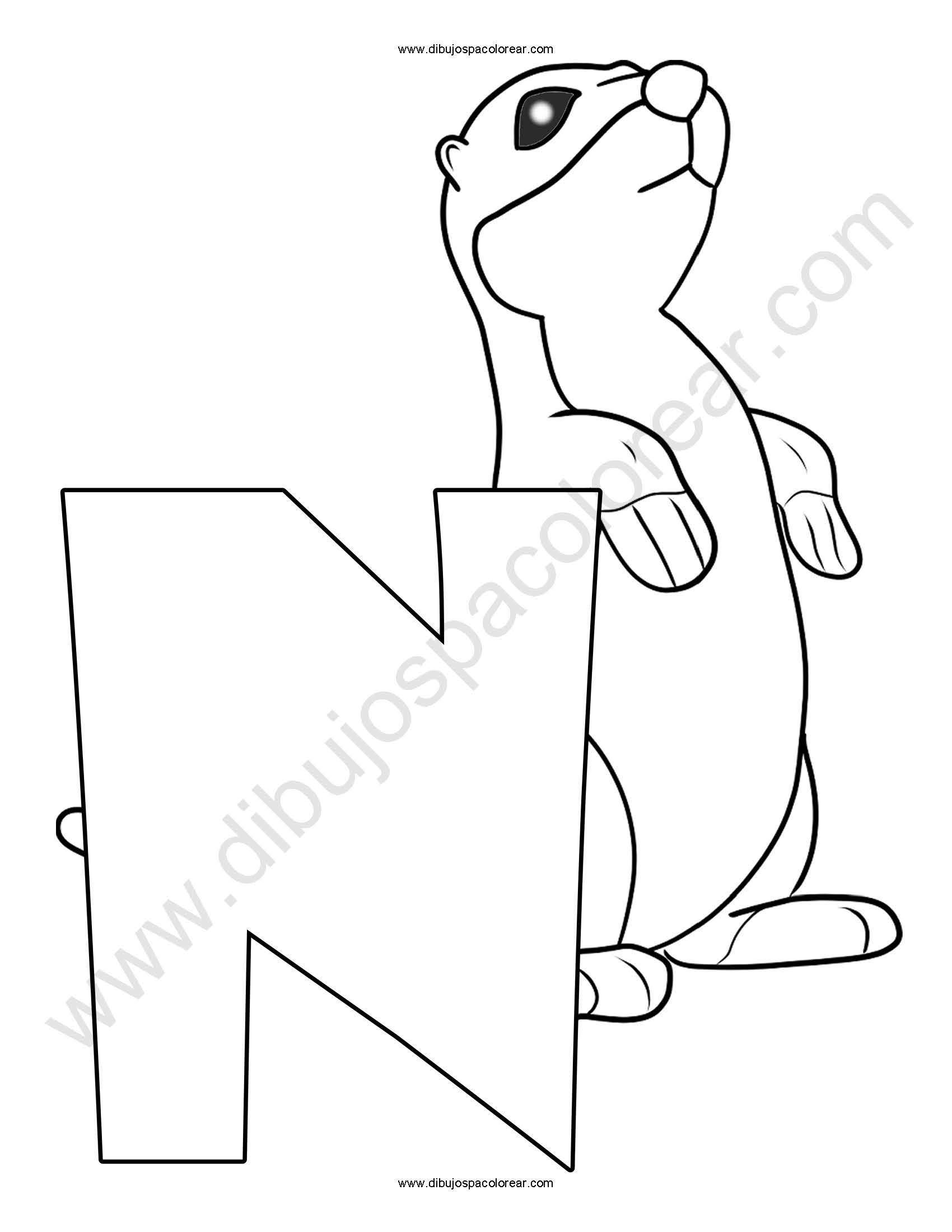 Letra N Nutria abecedario dibujo a color y para colorear.