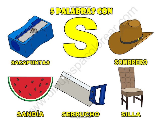 Cinco Palabras con la letra S dibujo a color y para colorear.