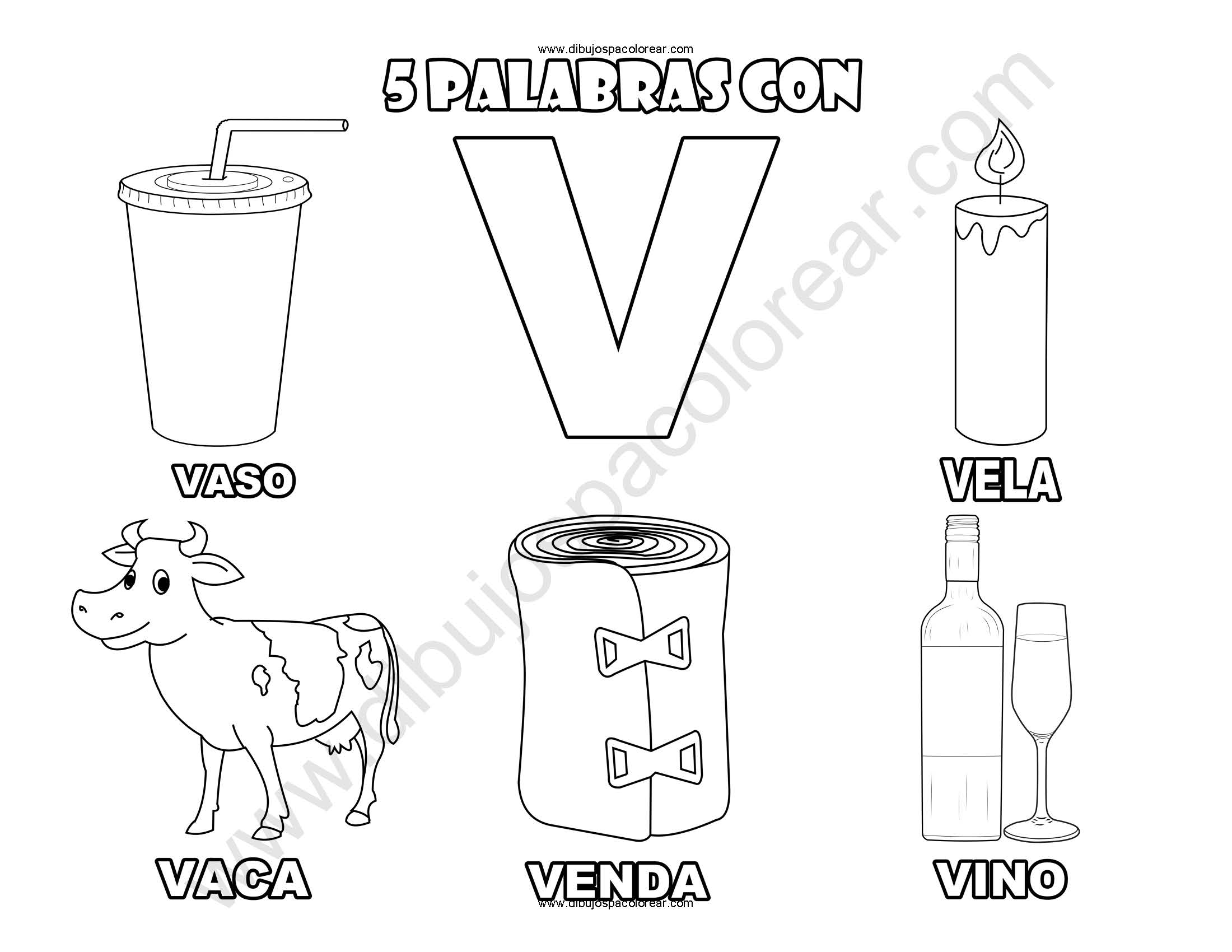 Cinco Palabras con la letra V dibujo a color y para colorear.